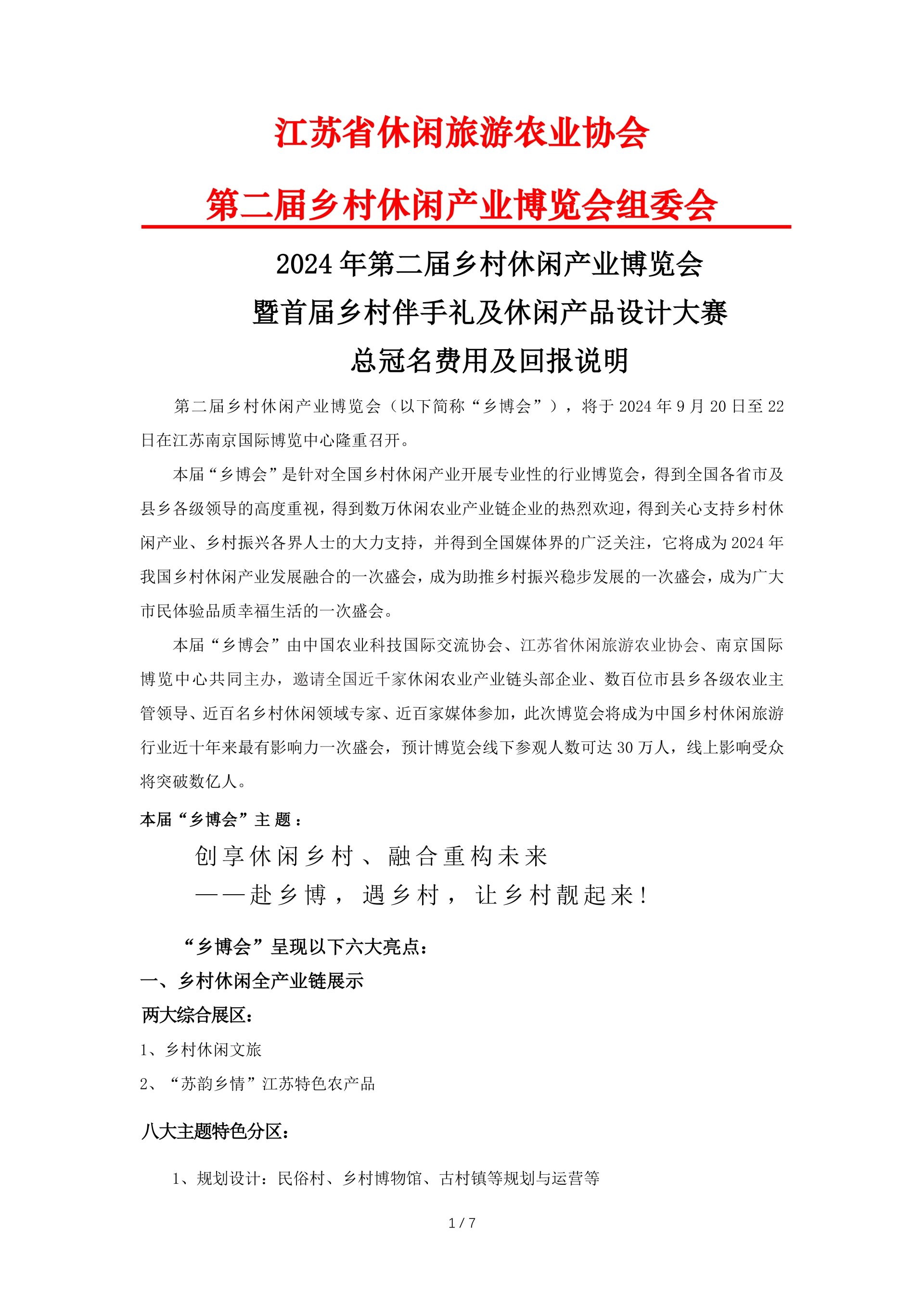 第二届乡村休闲产业博览会(以下简称“乡博会”),将于 2024 年 9 月 20 日至 22 日在江苏南京国际博览中心隆重召开。 本届“乡博会”是针对全国乡村休闲产业开展专业性的行业博览会,得到全国各省市及 县乡各级领导的高度重视,得到数万休闲农业产业链企业的热烈欢迎,得到关心支持乡村休 闲产业、乡村振兴各界人士的大力支持,并得到全国媒体界的广泛关注,它将成为 2024 年 我国乡村休闲产业发展融合的一次盛会,成为助推乡村振兴稳步发展的一次盛会,成为广大 市民体验品质幸福生活的一次盛会。 本届“乡博会”由中国农业科技国际交流协会、江苏省休闲旅游农业协会、南京国际 博览中心共同主办,邀请全国近千家休闲农业产业链头部企业、数百位市县乡各级农业主 管领导、近百名乡村休闲领域专家、近百家媒体参加,此次博览会将成为中国乡村休闲旅游 行业近十年来最有影响力一次盛会,预计博览会线下参观人数可达 30 万人,线上影响受众 将突破数亿人