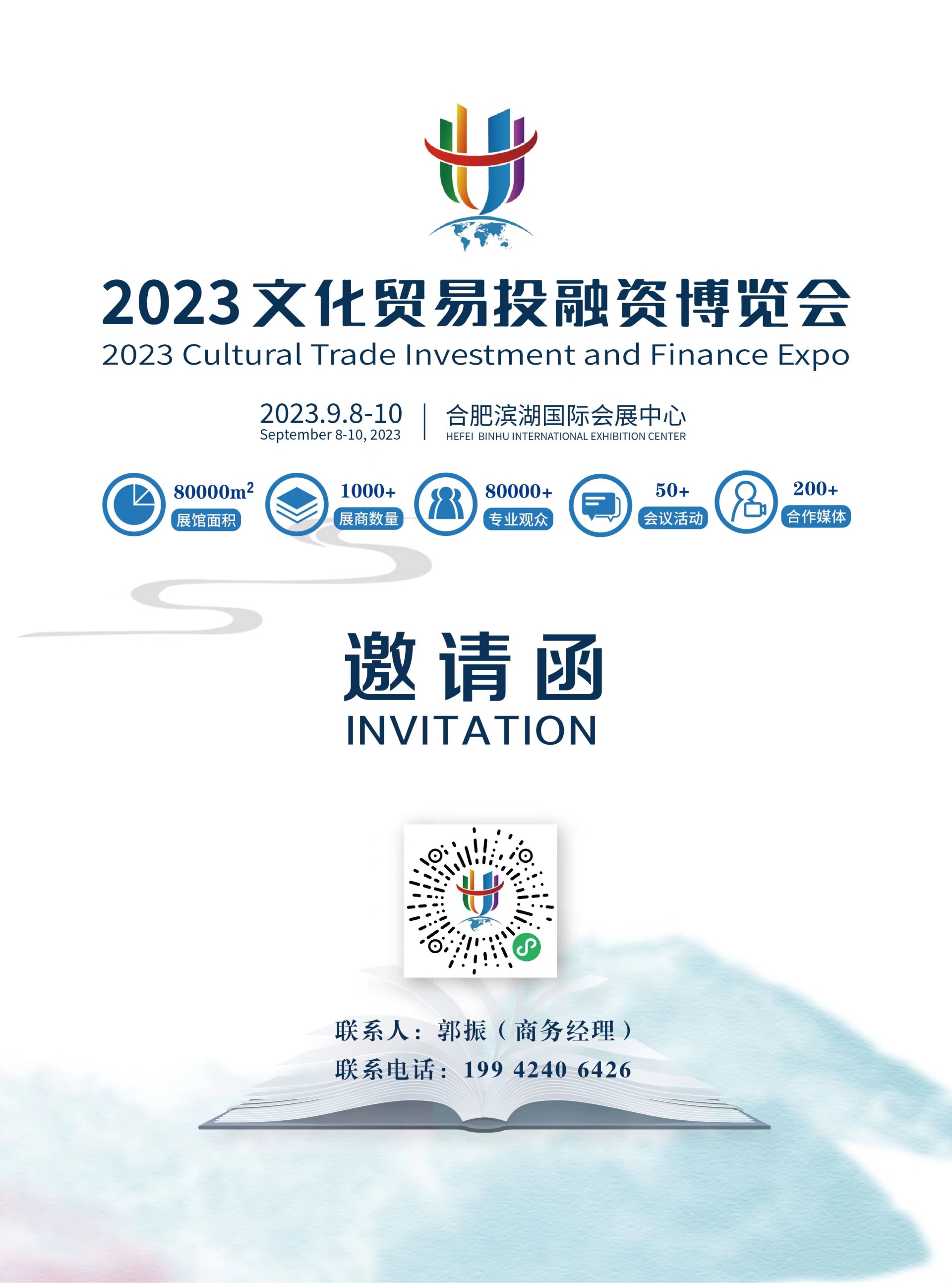 2023文化贸易投融资博览会 主题:世界文化共享 全球贸易共赢 时间:2023年9月8-10日 地点:合肥滨湖国际会展中心 规模:80000㎡ 合作咨询:15805685737