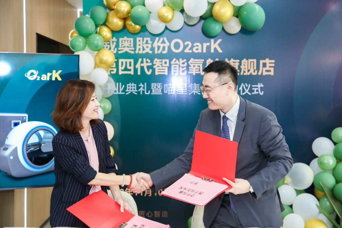 11月10日,威奥股份O2arK第四代智能氧舱旗舰店开业典礼暨喵星集团签约仪式启动,威奥股份常务副总经理兼威奥颐摩董事长孙继龙、威奥股份副总经理兼氧舱事业部总经理齐友峰、威奥股份氧舱事业部副总经理兼总工程师冯冰、喵星健康总经理徐晓蓓出席会议并签署“城市战略合作伙伴协议”。