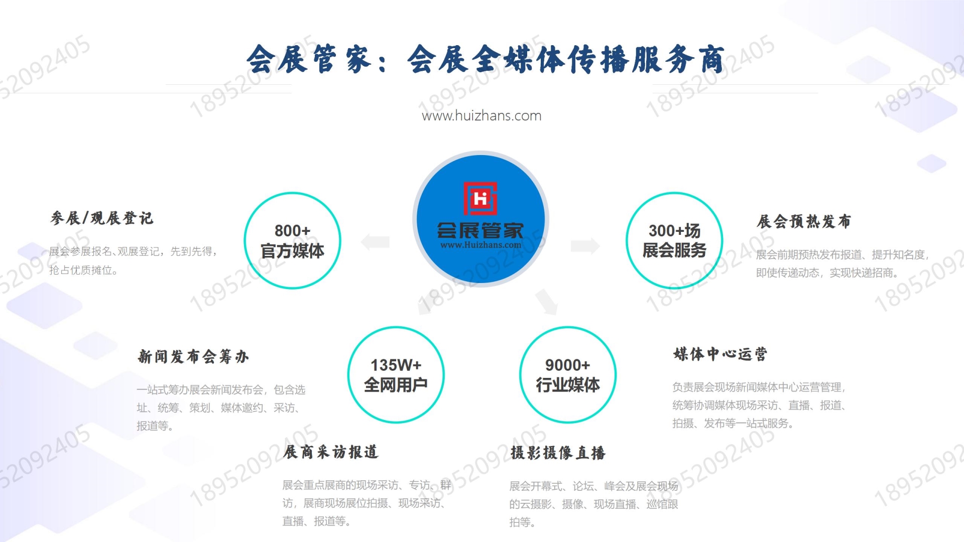 会展管家(Huizhans.com)平台是一个以互联网为基础,联合会务会展行业从业者、组织主办方、参会参展人员、供应商、服务商,结合大数据分析技术,按照约定的协议把会务会展供应链各参与方和关联方通过互联网连接起来,通过智能化识别、定位、个性化服务和精细化管理,实现会务会展高效率、低成本信息交互的一个实时信息交互与资源共享服务平台。