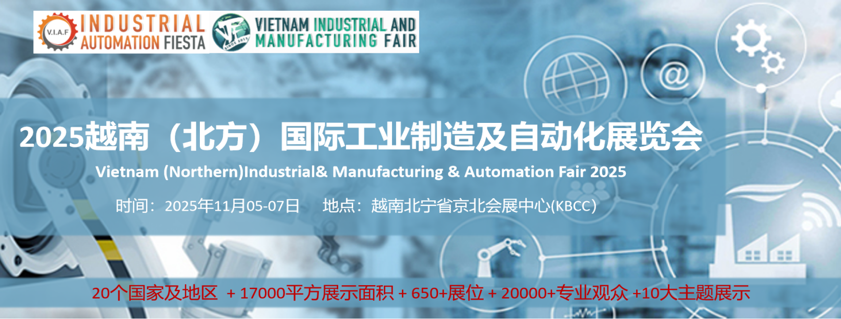 展会设有自动化工厂专题,以工厂自动化、生产自动化、机器人自动化、制造过程、物流自动化和包装自动化的为优先主题展示,8年的发展使得VIAF&VIMF已经成为越南的制造业生态系统向数字化、智能制造、智能工厂和工业4.0转变的专业交流及展示平台,引领着越南自动化控制市场的增长。上届共计20个国家及地区,17000平方展示面积,650+展位,490+展商,16000+专业观众,20+国内外工业领域专家参与,共享的工业盛宴。VIAF&VIMF也是众多国际工业技术品牌固定参加的工业展会。